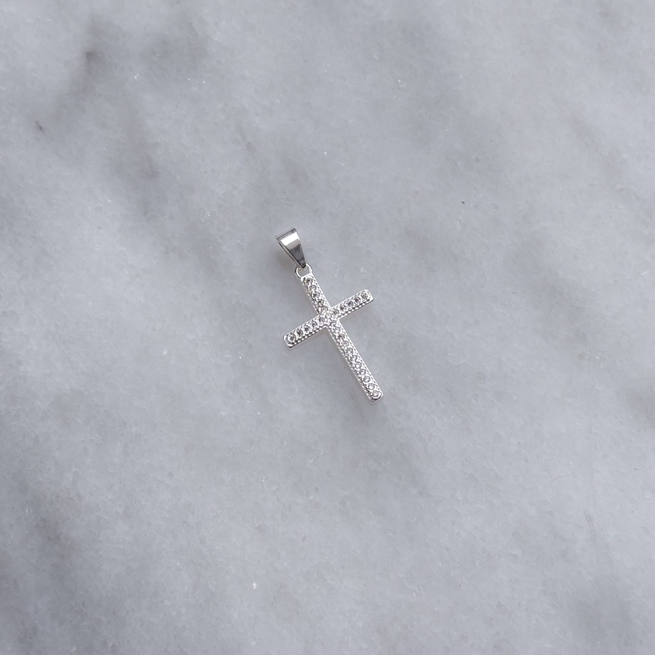 Dije laminado en plata en forma de cruz con piedras blancas